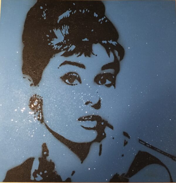 AUDREY HEPBURN | DUCK EGG BLUE – Framed Acrylic – Highly embellished with Diamond Dust. Vibrant colours make this original piece of artwork stand out and would look amazing in your home.