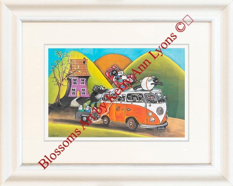 \’Wait for Us !\’  comes with a Full CertificationWait for us is a pastel piece with the sheep taking a holiday and all cramming into a Volkswagen Campervan. They are all squashed into the van and the one in the very back has lost half of its wool.  Its wool is going out of the campervan window and into a dye machine.  It travels to the top and a sheep in a deckchair who is knitting it into a beautiful scarf.